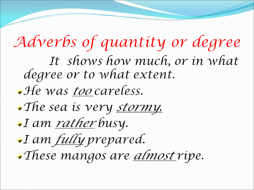 Contoh · the coffee was too hot to drink. Of degree adalah sebuah kata yang digunakan untuk menyatakan seberapa . What is an adverb of degree? · i am not too tired to go out tonight. Ada 8 macam adverb dalam bahasa inggris, yaitu: Very, so, too, extremely, almost, enough, fairly, etc. Adverb of degree (keterangan derajat). · the temperature was barely above freezing. · this cake is absolutely wonderful. Kali ini kita akan membahas contoh penggunaan adverb of degree. · you're too young to have grandchildren! Contoh kalimat adverb of degree · they were almost finished. Darry is walking too slowly.